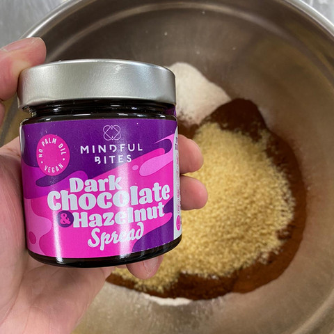 - Add the water, followed by the vegetable oil and the Mindful Bites dark chocolate & hazelnut spread